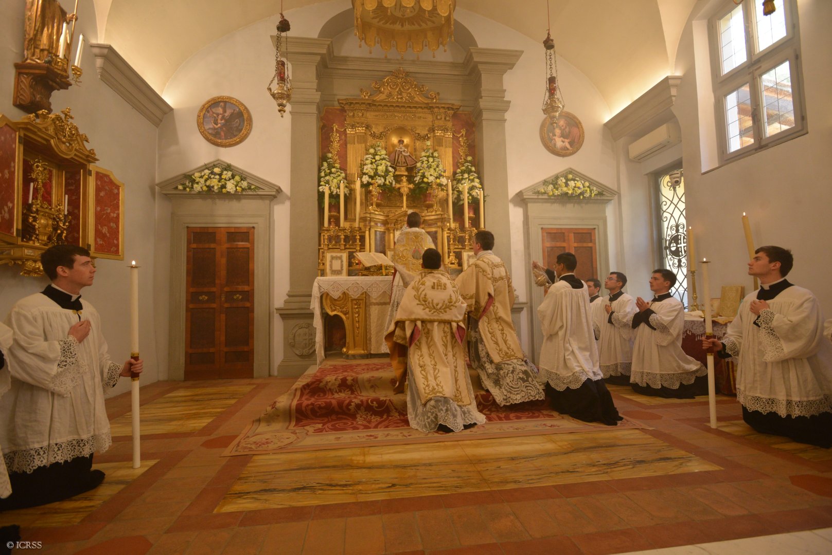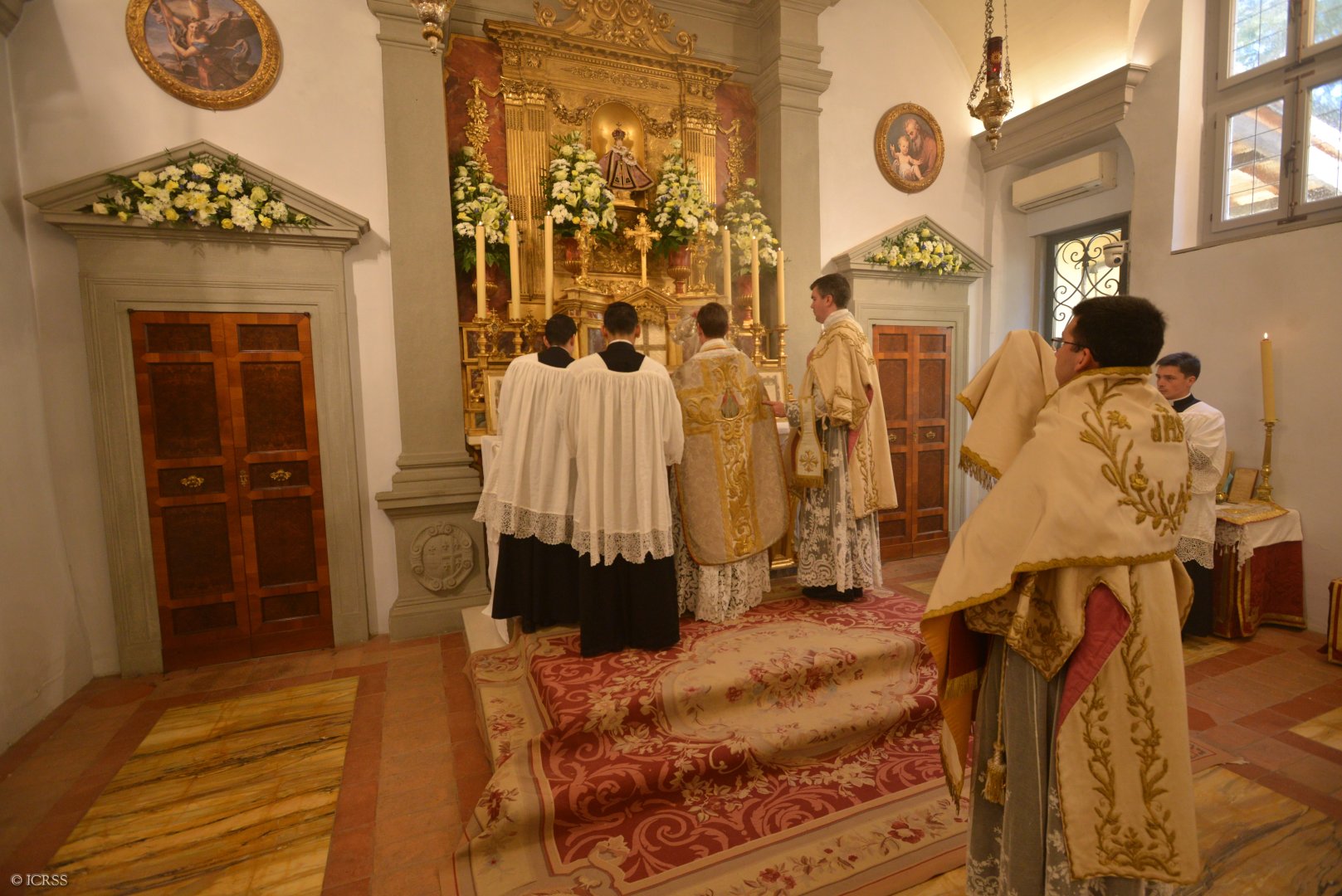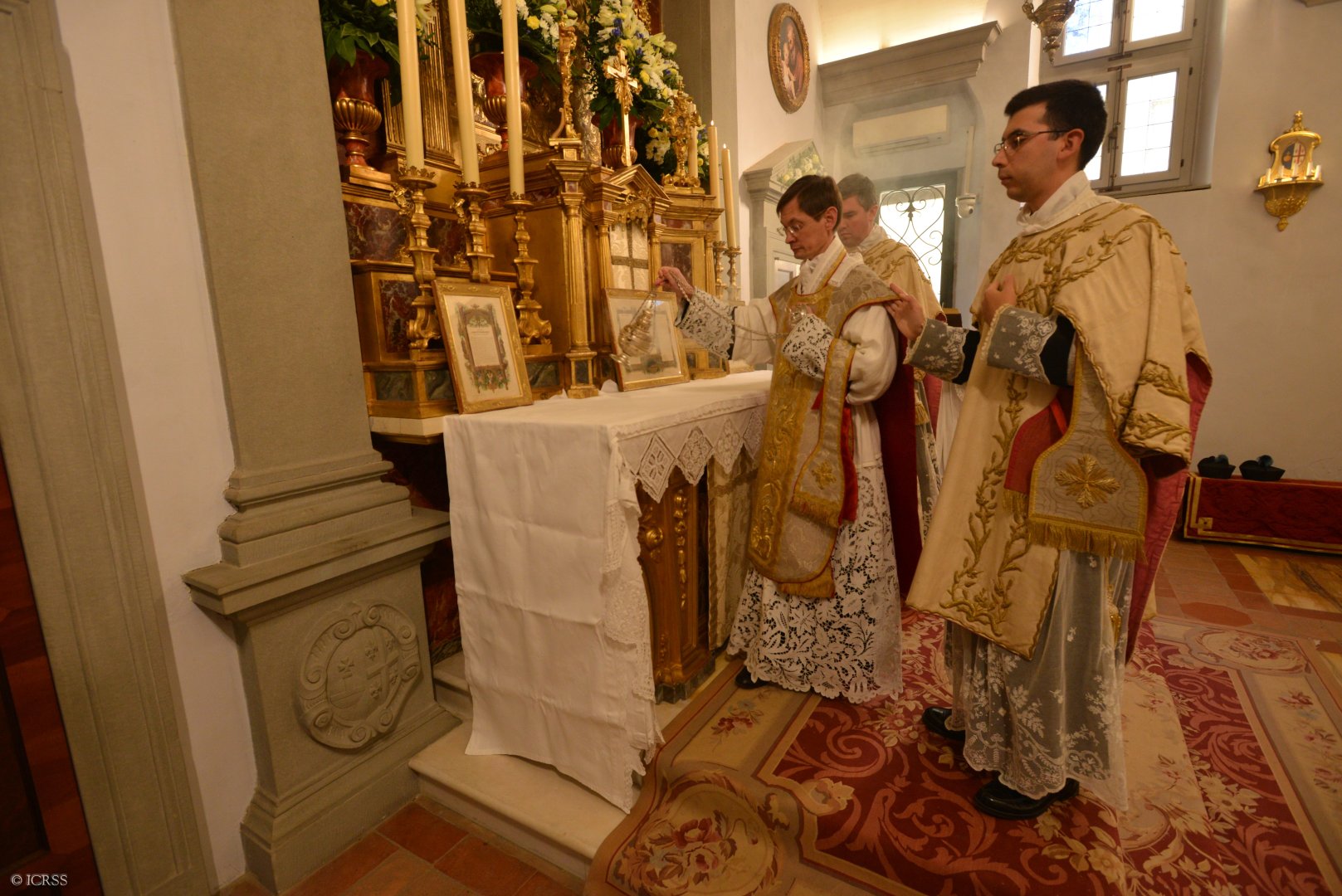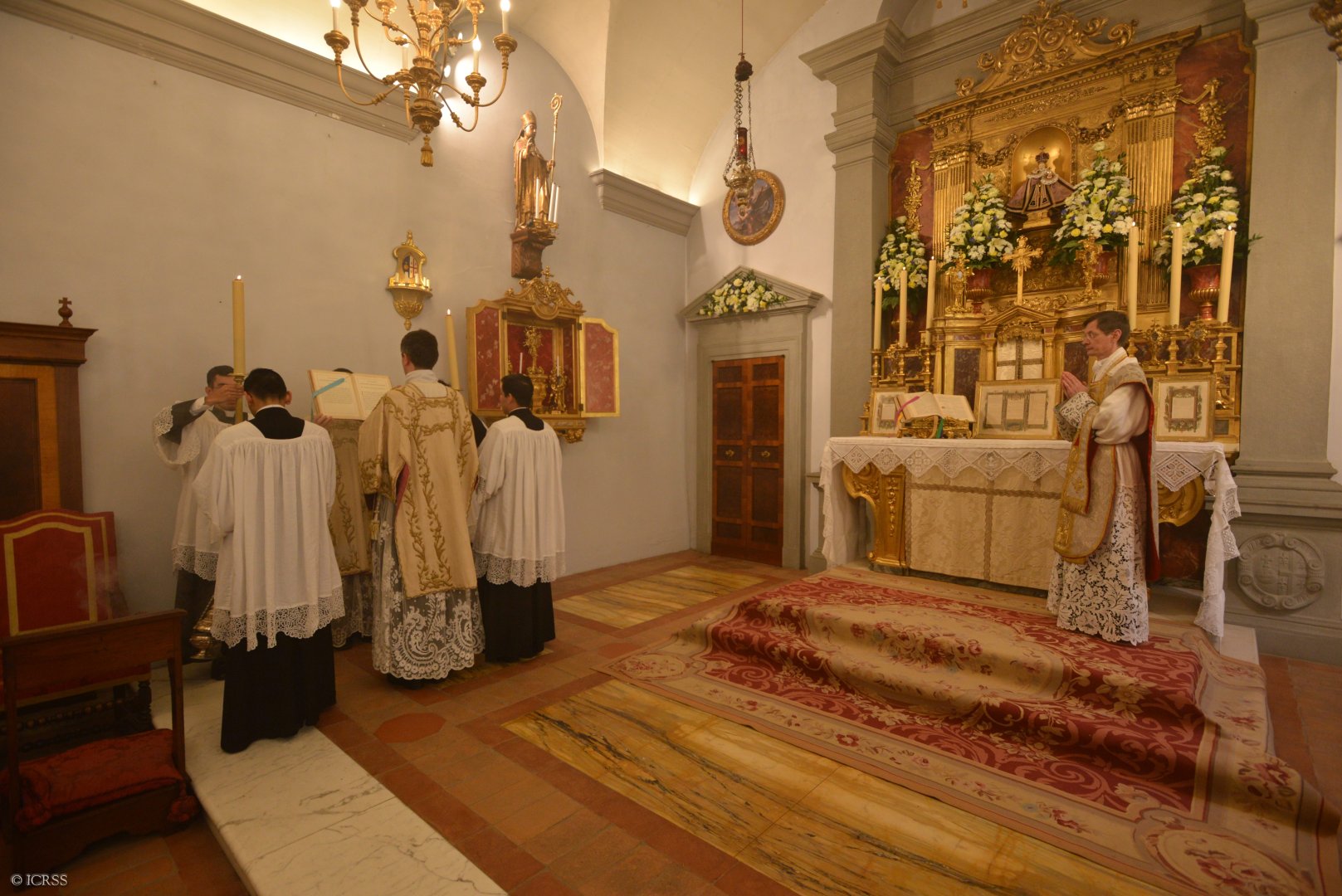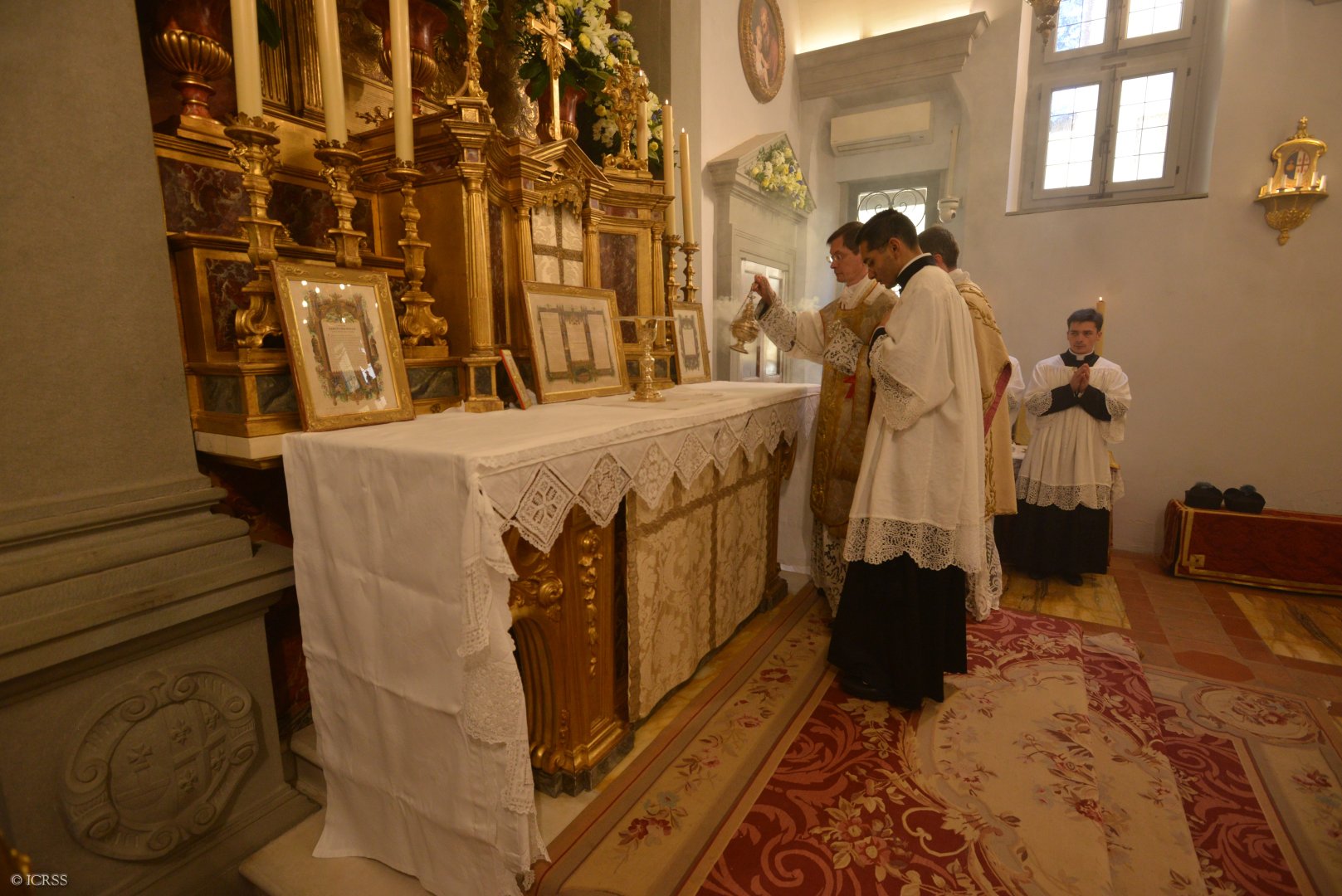 Celebrans wraz z usługującymi oddają cześć ołtarzowi po wejściu