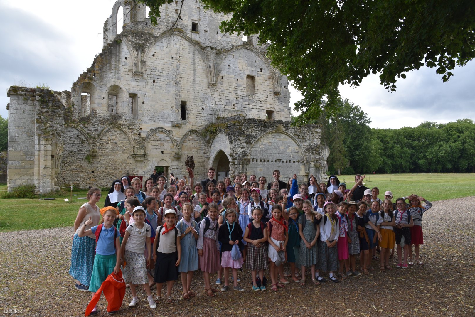 Zdjęcie grupowe podczas wycieczki — obóz dla dziewczynek Sługi Bożej Anny de Guigné w konwencie Sióstr Adoratorek w Loisy pod Paryżem