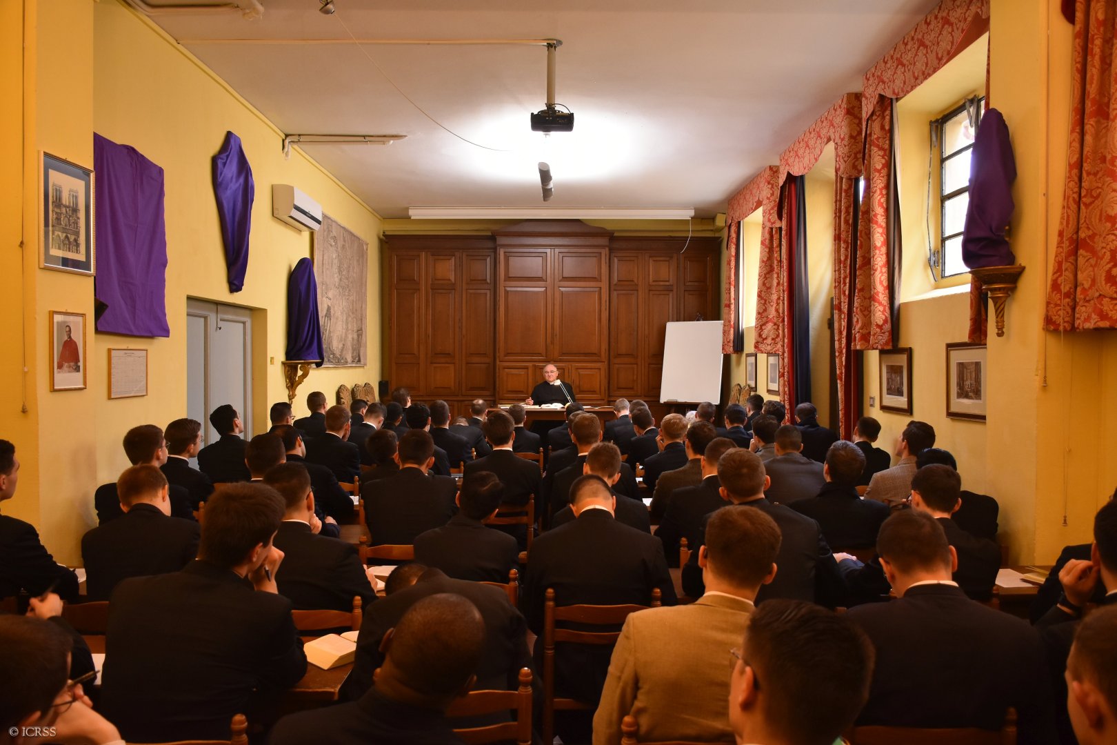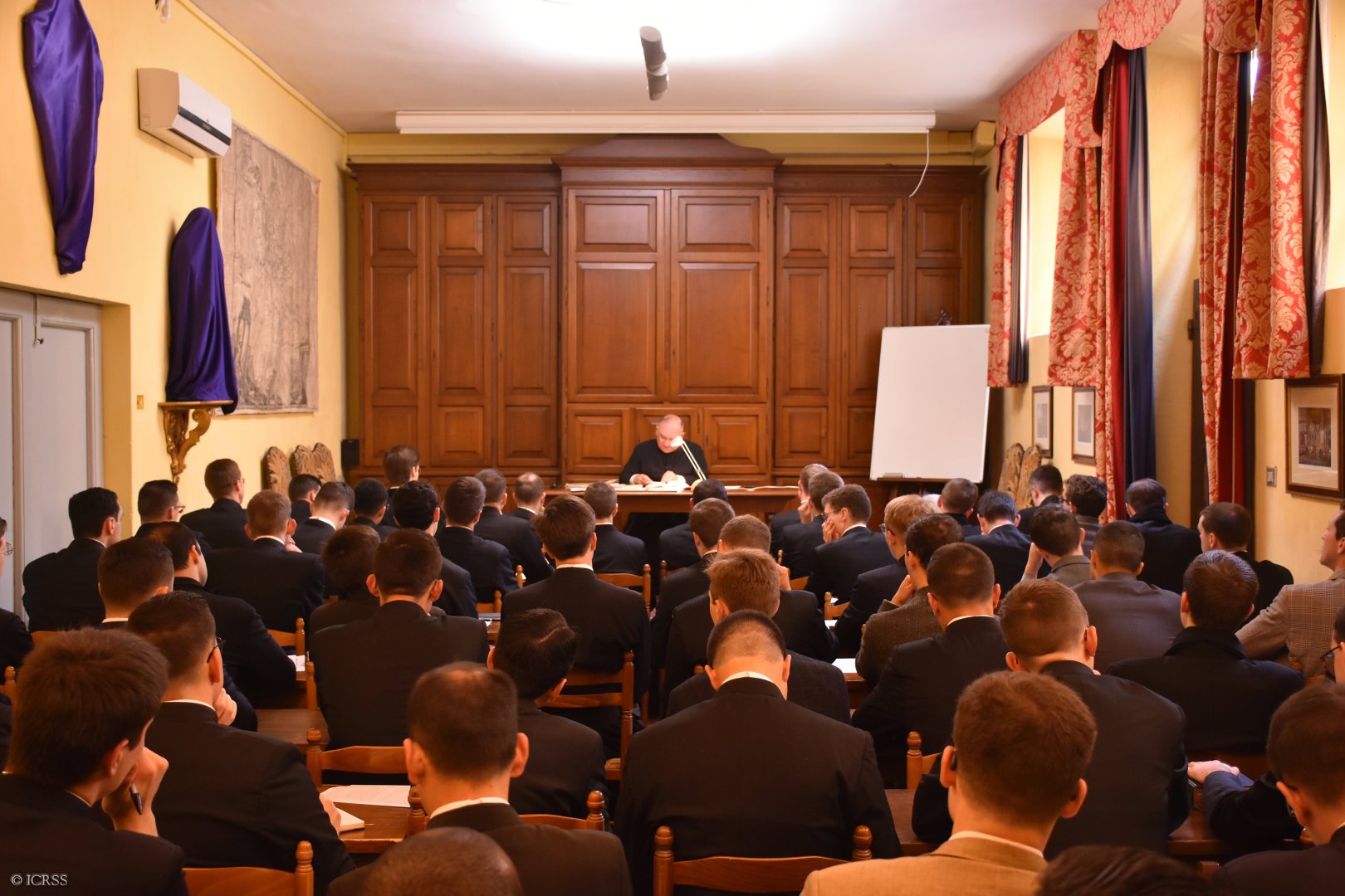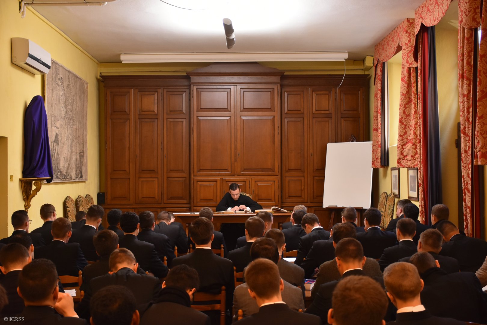 Ksiądz Kanonik Louis Poucin de Wouilt, seminaryjny mistrz ceremonii, wygłasza konferencję o celebracjach liturgicznych Wielkiego Tygodnia