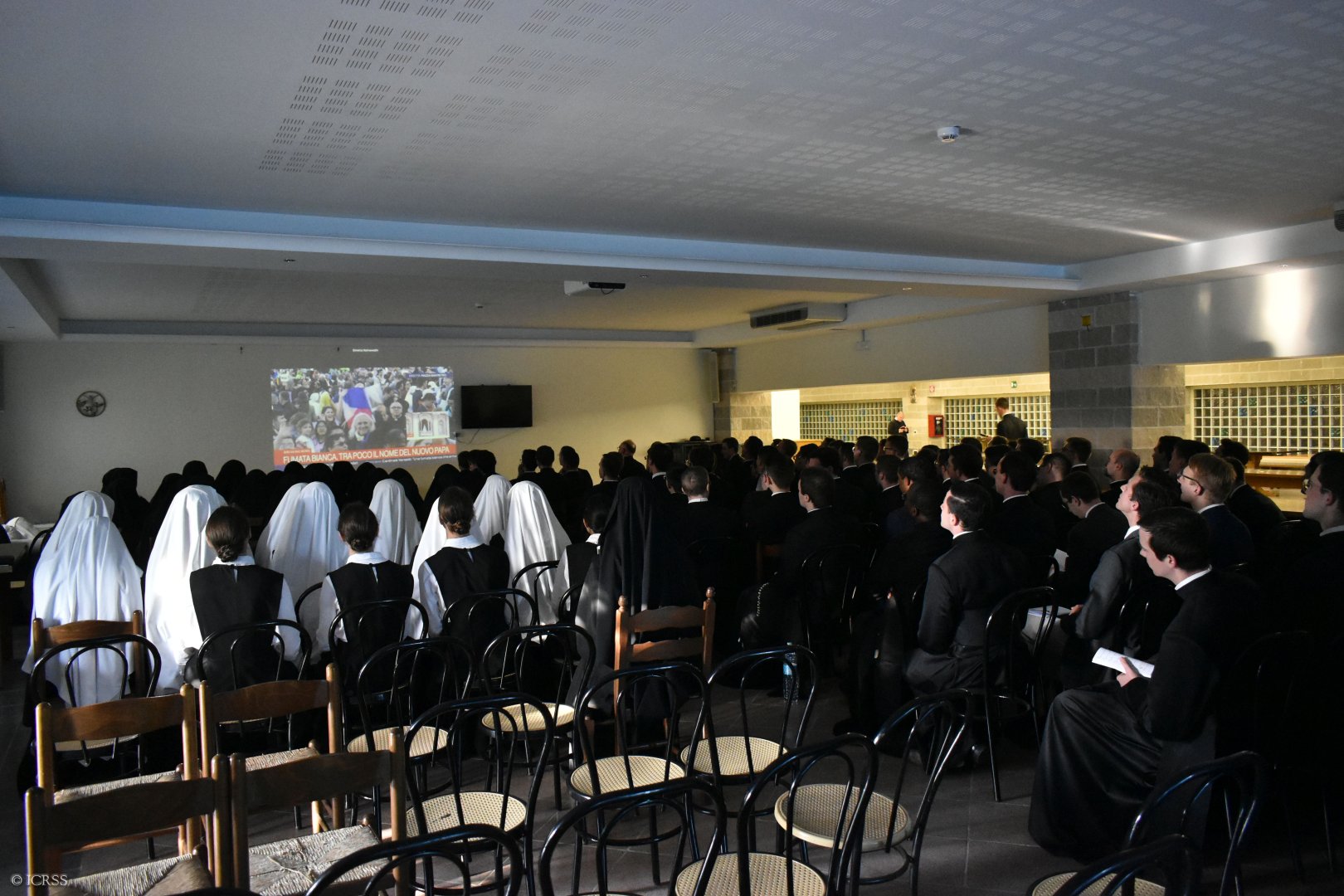 Seminarzyści i Siostry Adoratorki oczekują na pojawienie się nowowybranego papieża w transmisji na żywo po ukazaniu się białego dymu z Kaplicy Sykstyńskiej