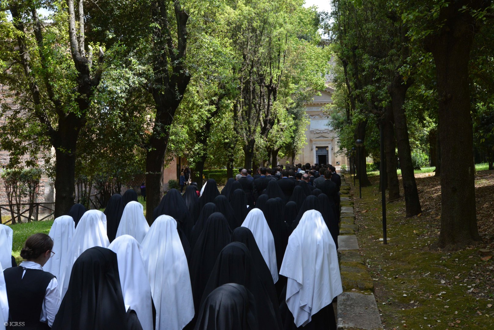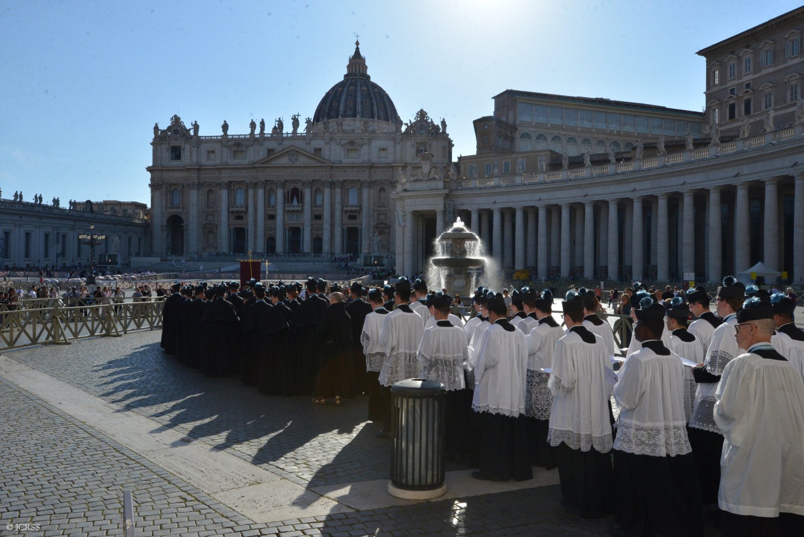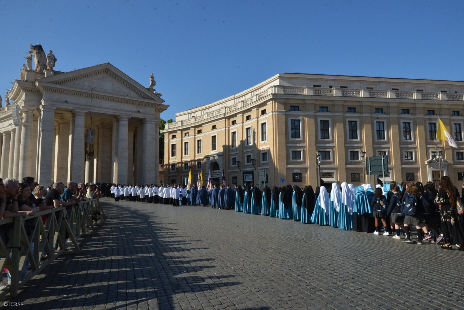 Księża Kanonicy, klerycy, oblaci, Siostry Adoratorki oraz wierni Instytutu modlą się na różańcu gdy procesja wchodzi na Plac św. Piotra
