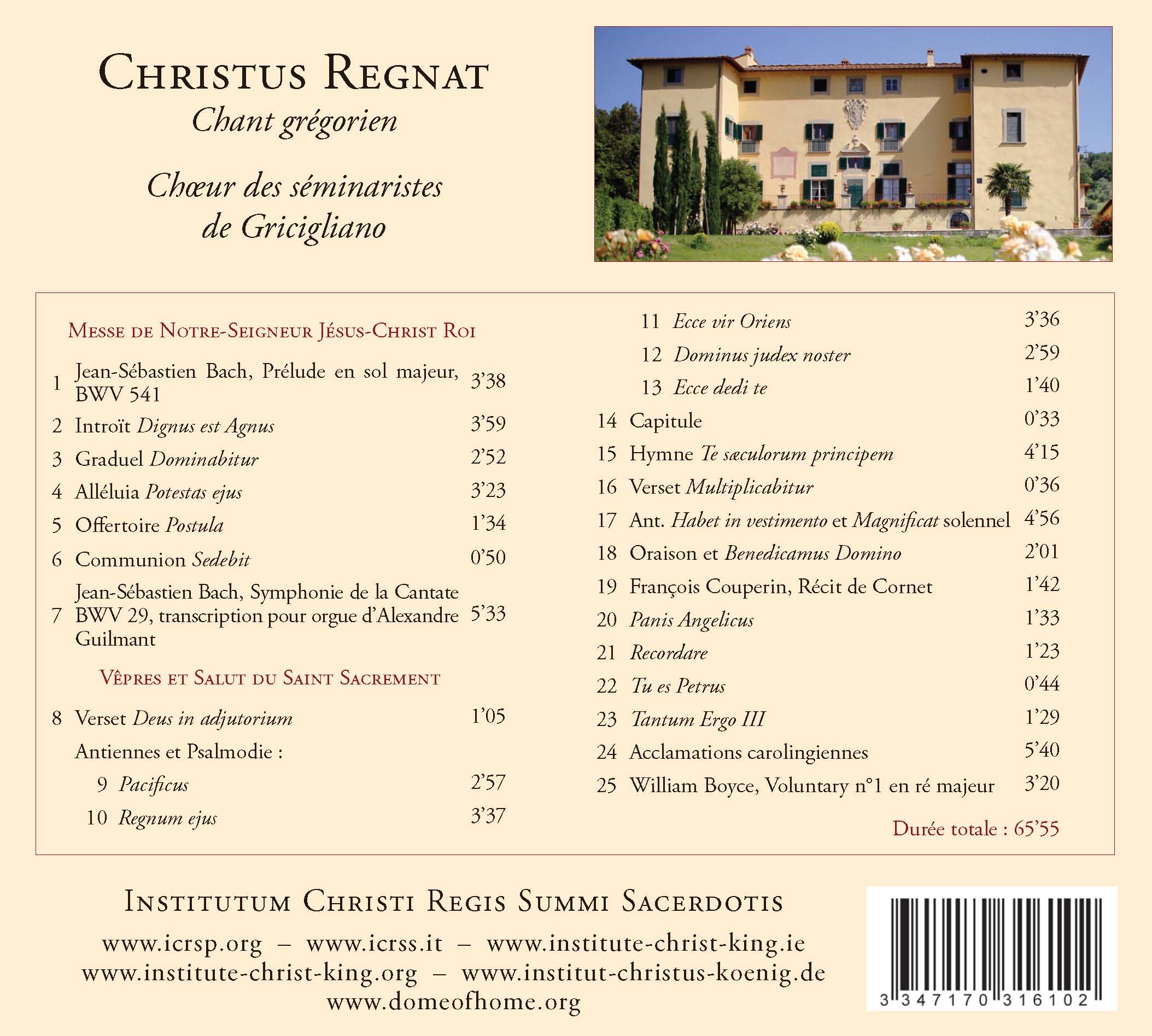 Seminarzyści Instytutu Chrystusa Króla Najwyższego Kapłana mają przyjemność zaprezentować nagranie zrealizowane w związku z naszym świętem tytularnym zatytułowane Christus Regnat na cześć Chrystusa Króla. Święto to zostało ustanowione w roku 1925 przez papieża Piusa XI encykliką Quas Primas. Pierwszą więc część tej płyty stanowią teksty własne Mszy św. z tego święta.