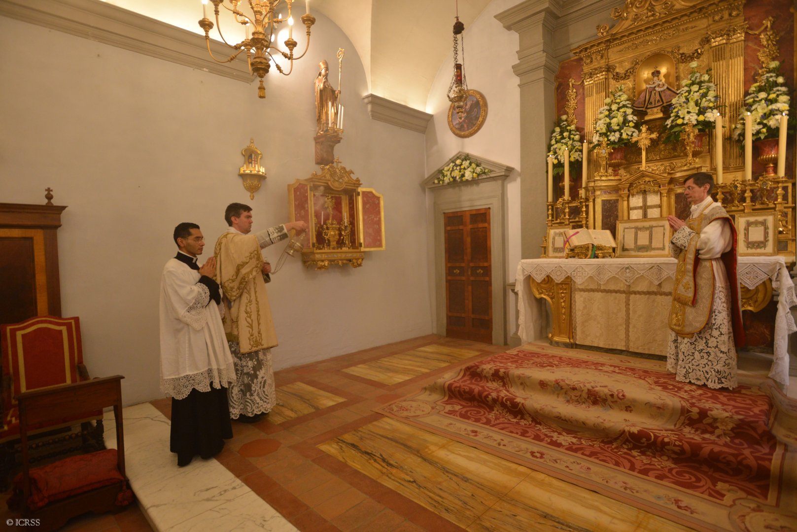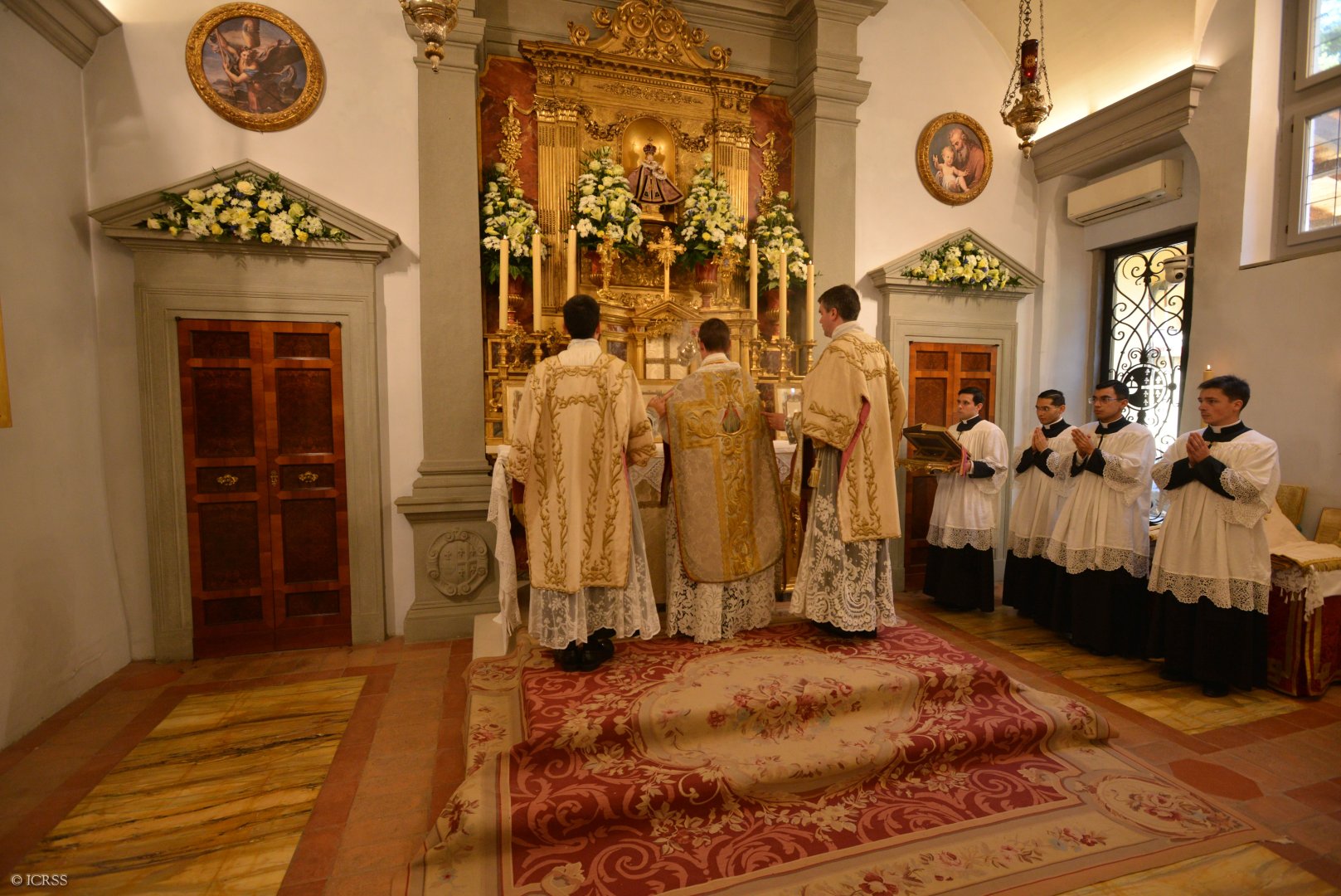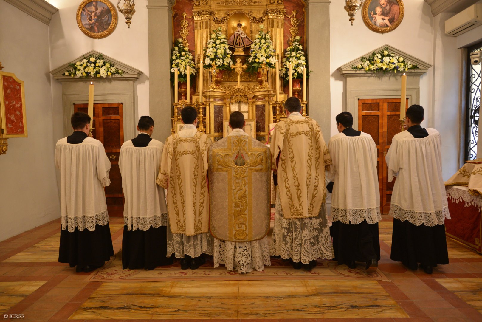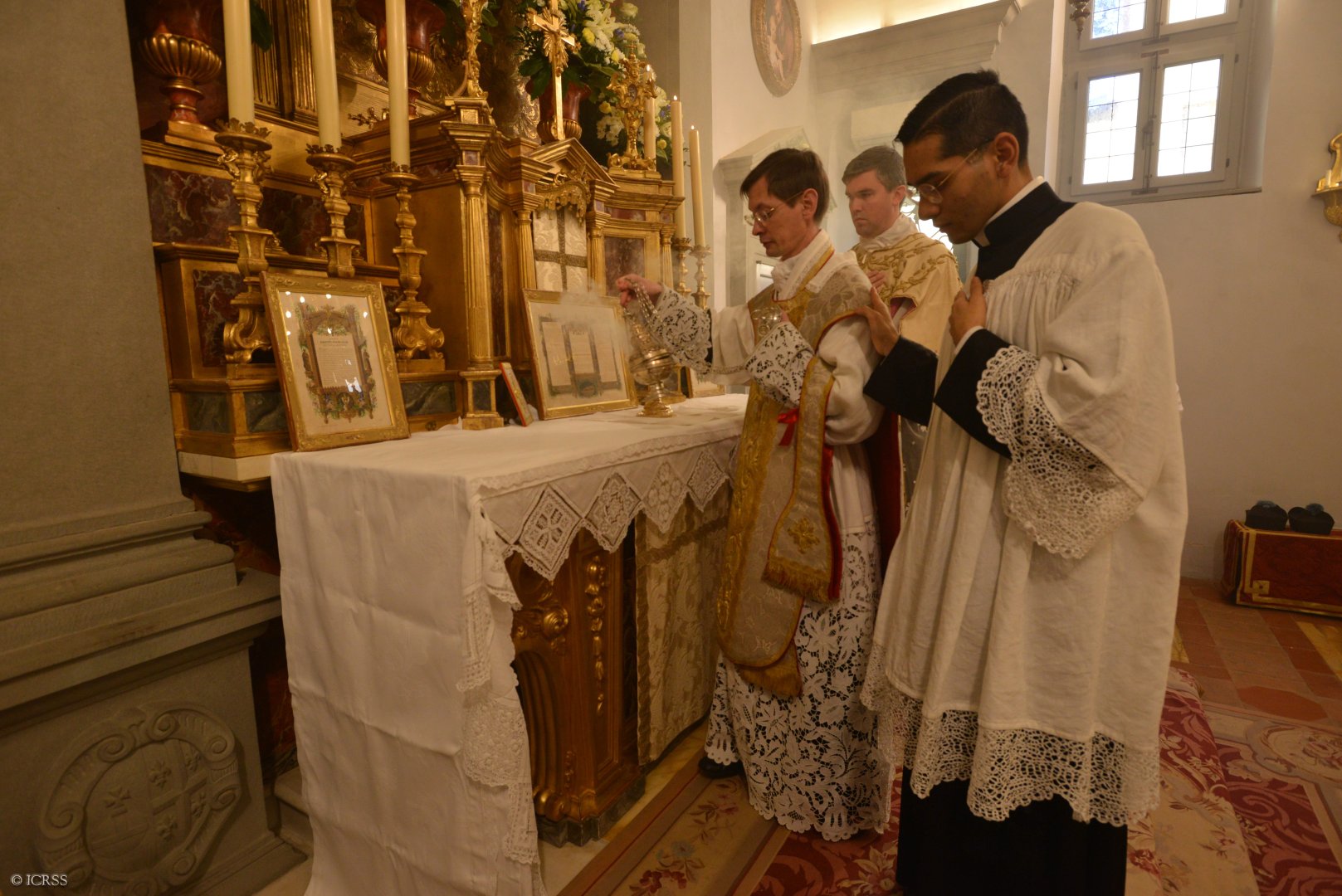 Celebrans wraz z usługującymi oddają cześć ołtarzowi po wejściu