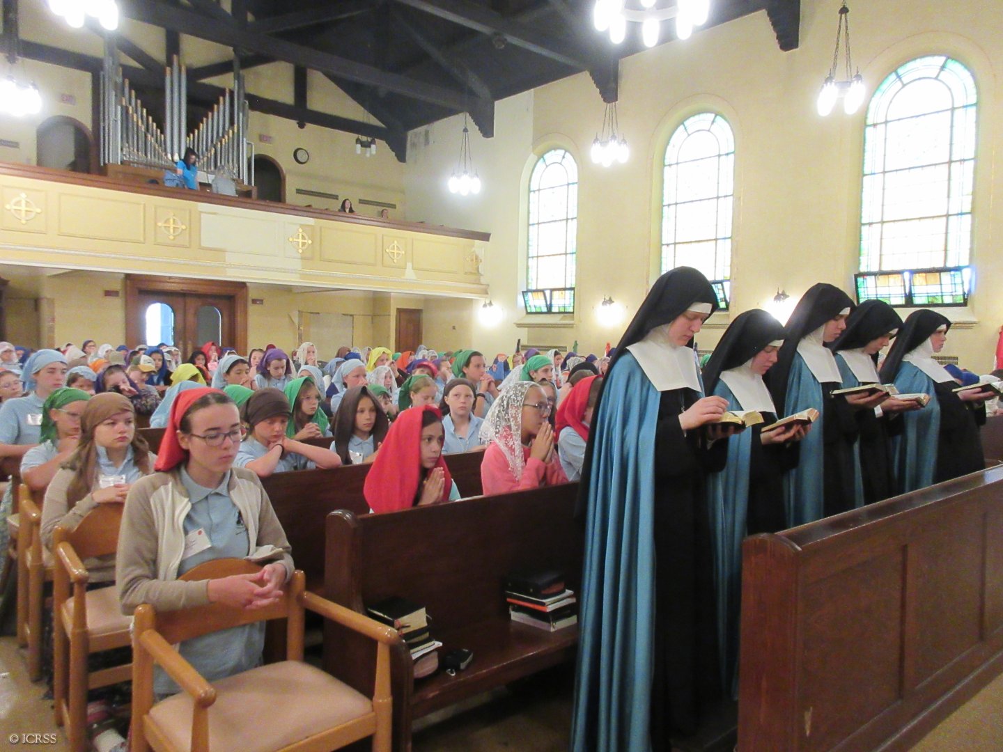 W kościele — obóz św. Teresy dla dziewczynek w Burlington, stan Wisconsin na północy Stanów Zjednoczonych Ameryki