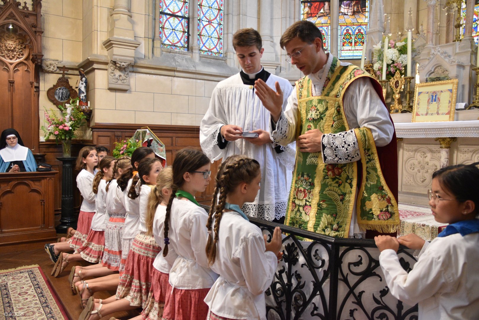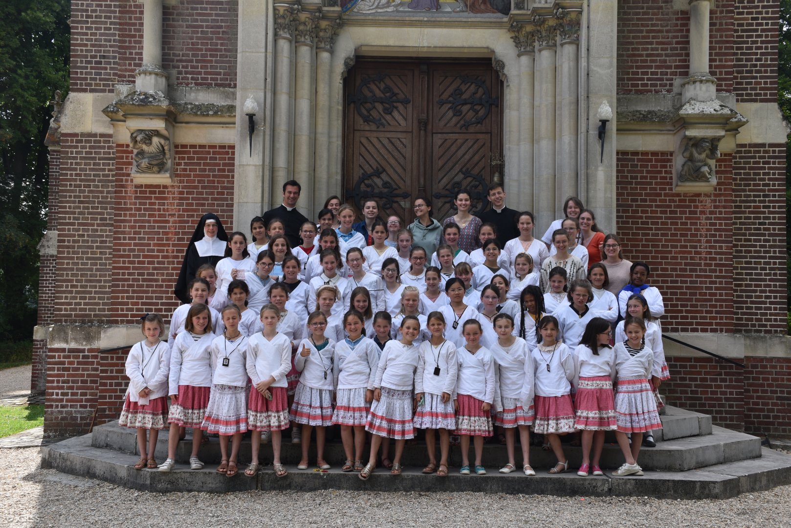 Błogosławieństwo prymicyjne — obóz dla dziewczynek Sługi Bożej Anny de Guigné w konwencie Sióstr Adoratorek w Loisy pod Paryżem