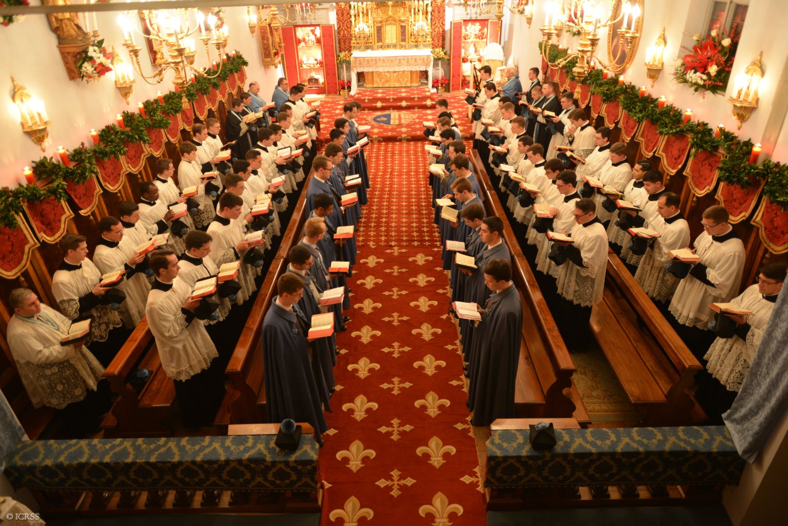 Klerycy śpiewają dla Księdza Kardynała i Przełożonych Instytutu Minuit chrétiens — francuską kolędę