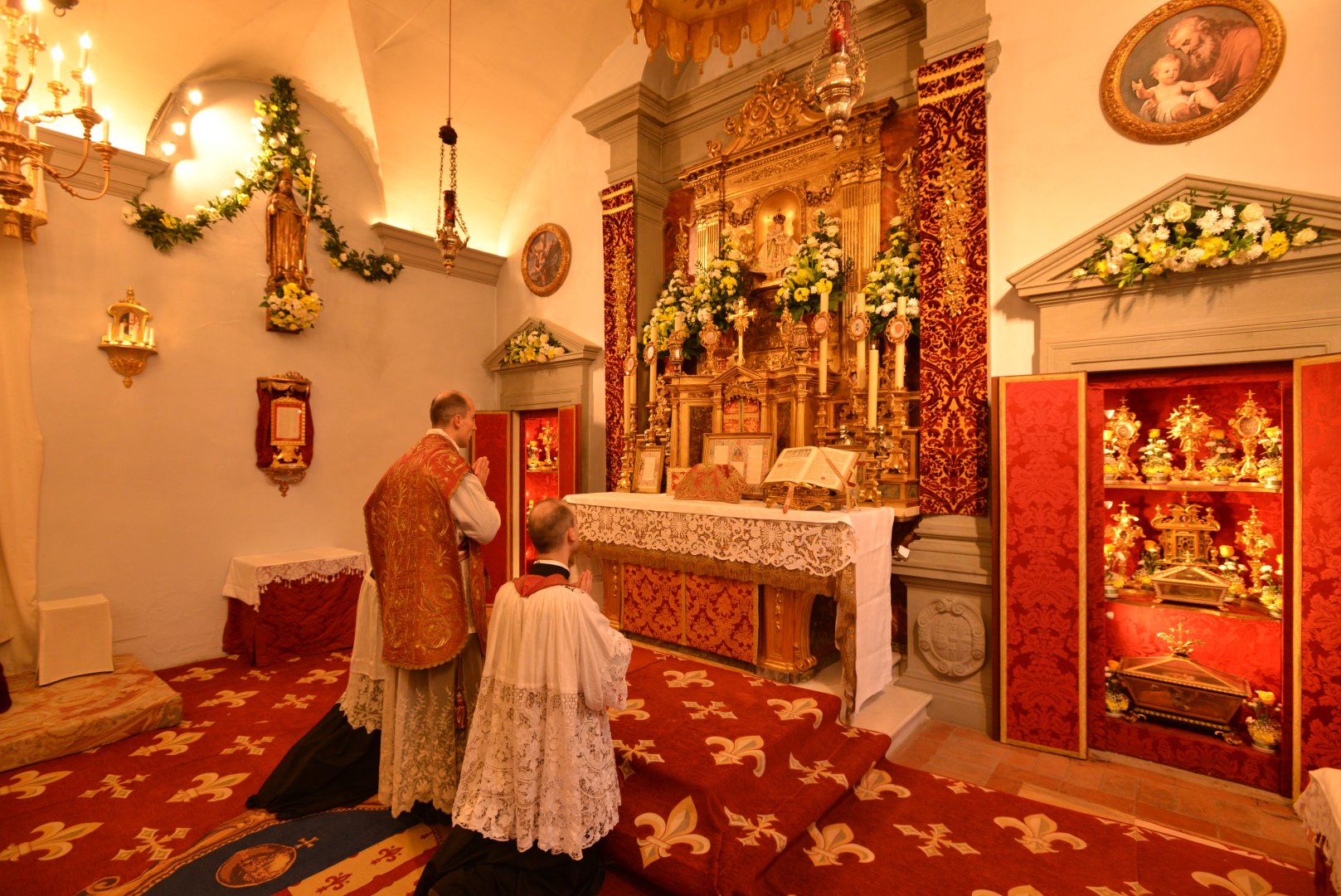 Pozdrowienie ołtarza — kardynał modli się chwilę w ciszy po wejściu do kaplicy