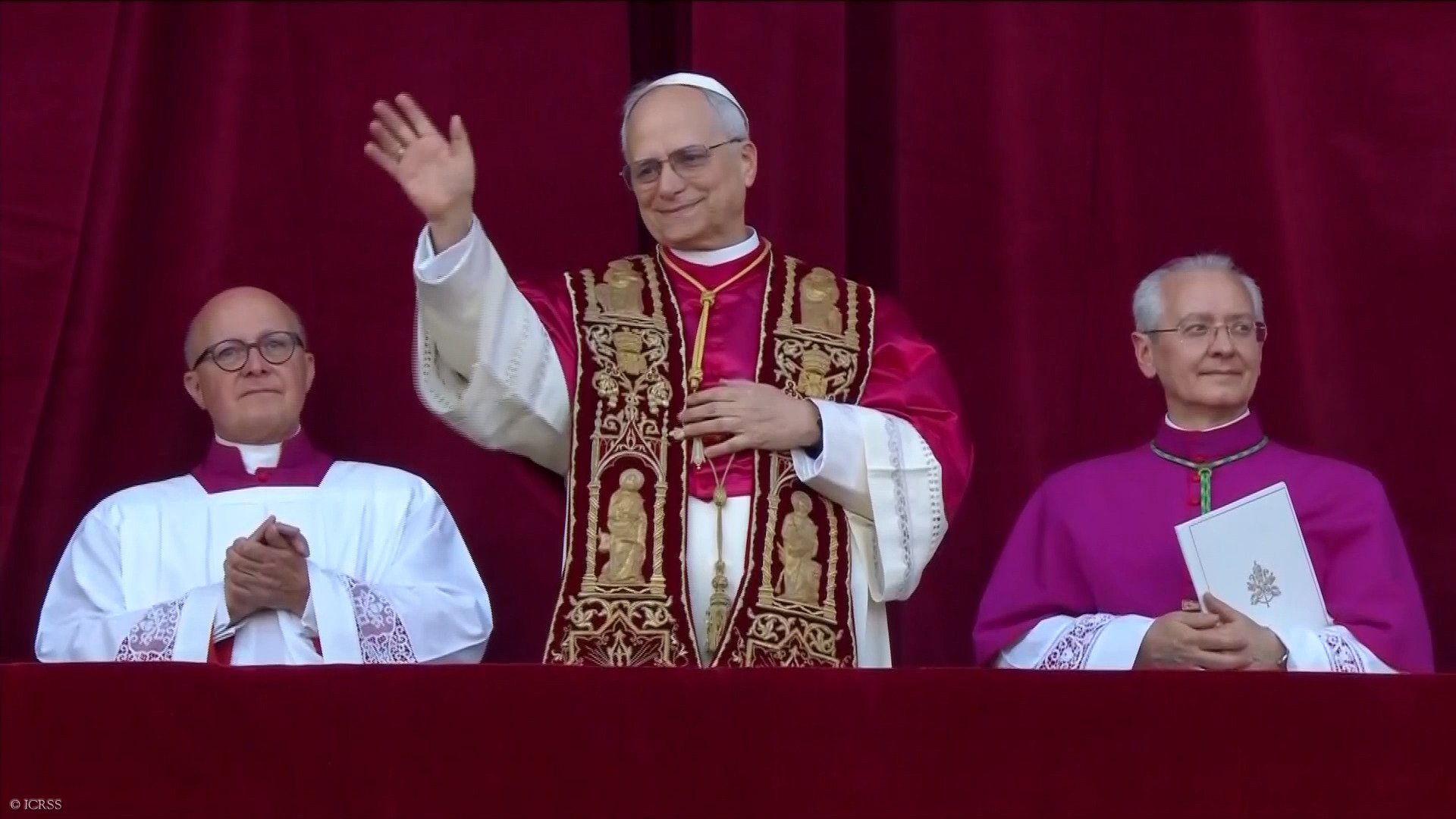 Jego Świętobliwość papież Leon XIV na balkonie Bazyliki Świętego Piotra w towarzystwie Księdza Prałata Agostini'ego, ceremoniarza papieskiego i przyjaciela Instytutu