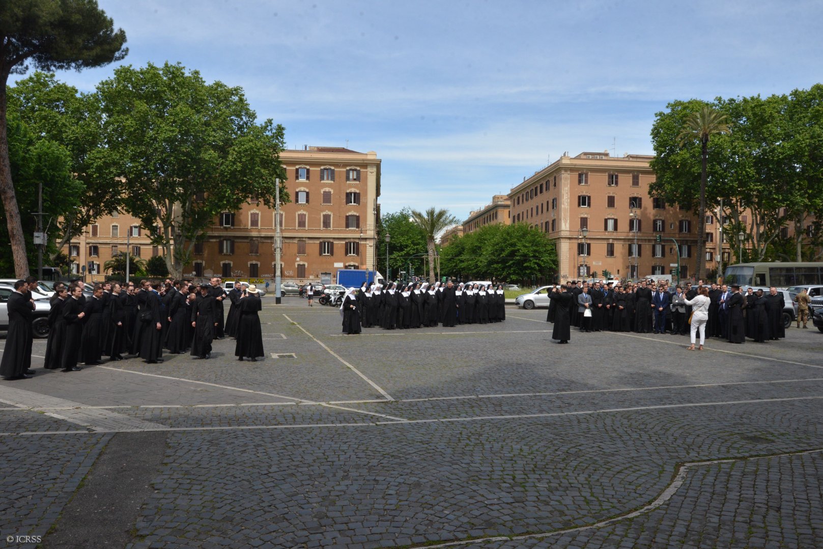 Księża Kanonicy, klerycy, oblaci, Siostry Adoratorki oraz wierni Instytutu modlą się na różańcu gdy procesja wchodzi na Plac św. Piotra